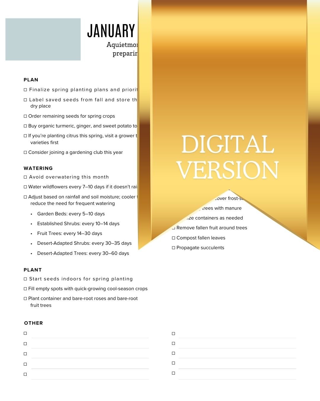 Plan with confidence in a hot, dry climate. This downloadable, full-color 85-page planner combines monthly planting windows, checklists, and guided journaling so you can make better decisions, season after season.